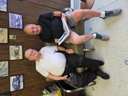 Karl Seitz & Tony Totero catching up on the local Racine news at Bob's Barber shop - Aug, 2025. Tony is giving a critical review of the 750 page "Bentz Family History" written by John McNamee as a tribute to the ten siblings of Linda Bentz and her parents who sacrificed everything, so many of their children could attend St Catherine's High School. Linda's older brother Danny, was the first 9 letter athlete at SCHS and taught 6th grade for forty years and was instrumental in building the Angels Alumni House at 1220 Villa Ave. Karl enjoyed his introduction to the Alumni group this last August and was warmly greeted by all.